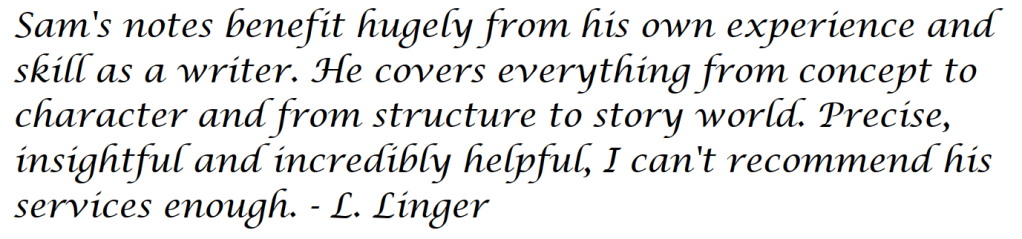 For an extra fee, I’ll assess your script and provide full feedback on where its strengths and weaknesses lie, paying special attention to vital elements like Story, Characters, Writing Style and so on.